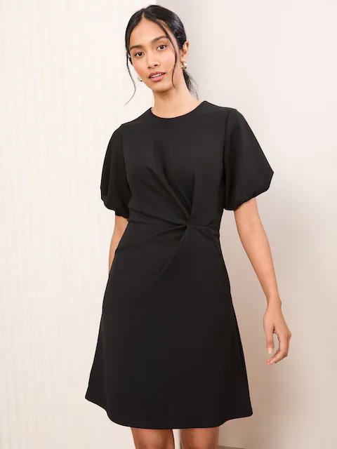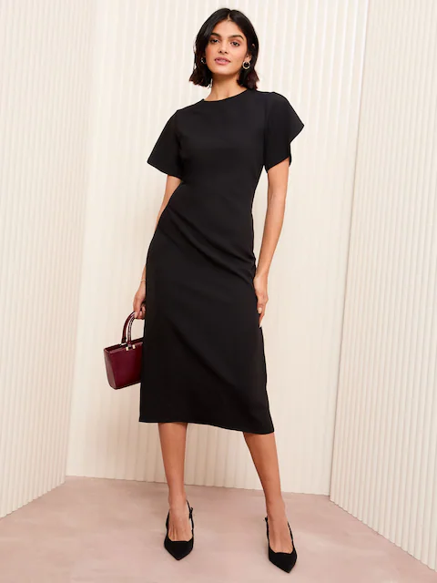 Friends Like These Black Short Sleeve Midi Tailored Dress With Ruche Detail