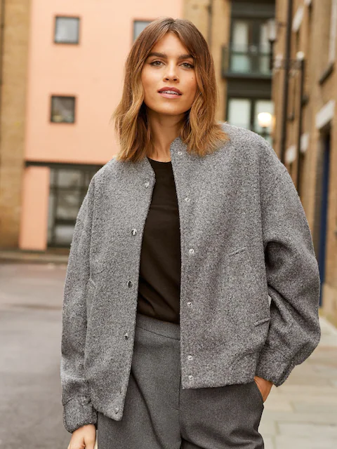 - Stylish relaxed fit bomber with soft boucle fabric, function side pockets and functional button through detailing this is the perfect jacket to lay up any look and wear through out all seasons.