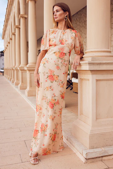 - Chiffon dobby flutter sleeve maxi dress with open back detail and empire bust seam.