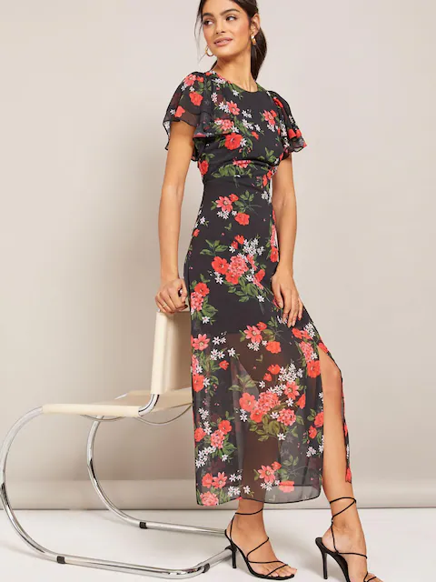 Friends Like These Black Floral Chiffon Flutter Sleeve Midi Dress