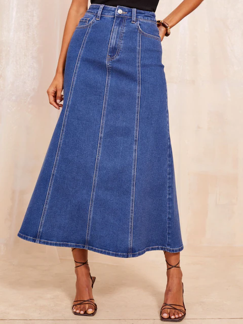 Friends Like These Dark Blue Seam Detail Flared Denim Skirt