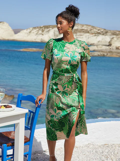 • The perfect floral dress in a gorgeous summer green, an ideal dress to wear to a wedding or the races. An easy satin finish to provide a flattering yet comfortable fit for a warm summer day.