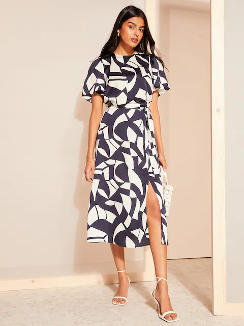 - Tie waist midi dress with round neck, flutter sleeves and split skirt detail.