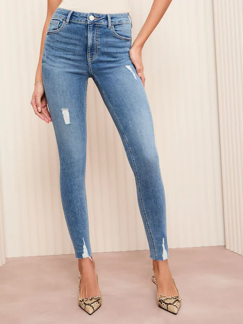 • Skinny Jeans with a ripped ankle grazer hem. An eye catching denim piece to help elevate the day to day look.
