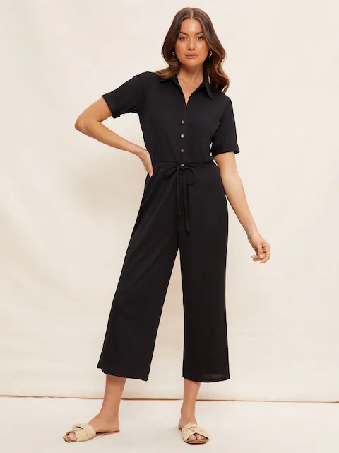 Friends Like These Black Jersey Short Sleeve Button Up Wide Leg Jumpsuit