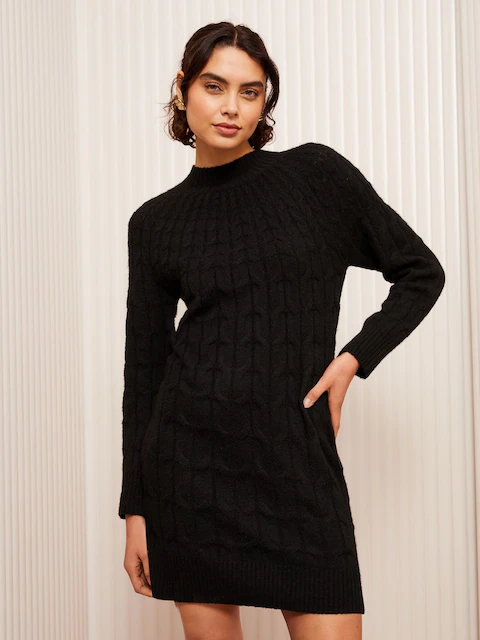 - Our high neck, cable knit dress is the perfect cosy essential. Finished at a mini length with high neck and a relaxed shape for added comfort. Pair with tights and your favourite pair of boots for a stylish seasonal look. Available in Black!