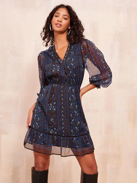 Friends Like These Blue Floral Long Sleeve Chiffon Mini Dress