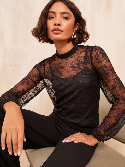 • Stunning long sleeve top, finished in lace and sequins. The perfect top for a party or dinner with friends, for an elegant and trendy look.