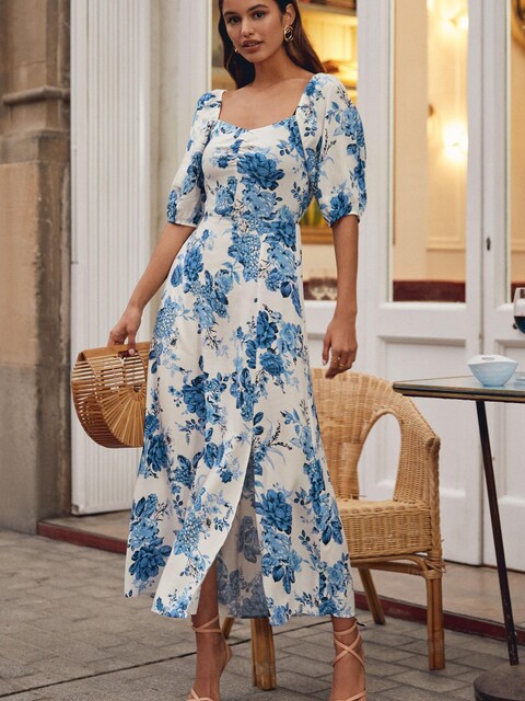 - Sweetheart Puff Sleeve Midi Dress with side split.