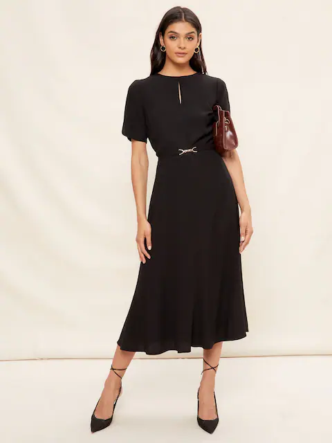 - Elegant fluted hem midi dress with minimal detail belt to cinch in your waist. Dress is fully lined and comes with belt.